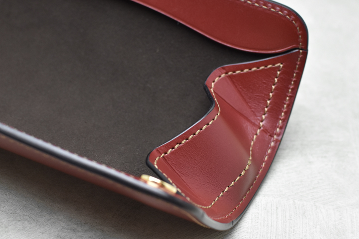 内部はスエードが貼られており、筆記具を優しく包み込みます。 またサイドのマチ部分はフラップを閉じた際に立ち上がり、収納したペンが抜け出ないよう隙間を塞ぎます。