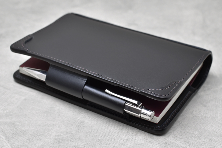 フラップ側の表紙にはペンホルダーが取り付けられており、ノートと一緒にペンも持ち運べます。