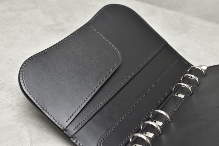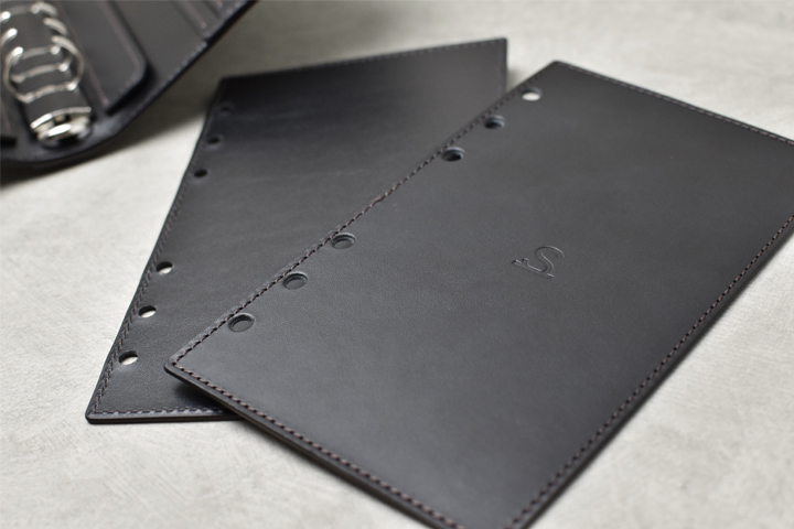 中央の6穴のバインダーは手の込んだ革巻き仕様で、バインダーには革製の下敷き(2枚セット)が標準装備されています。