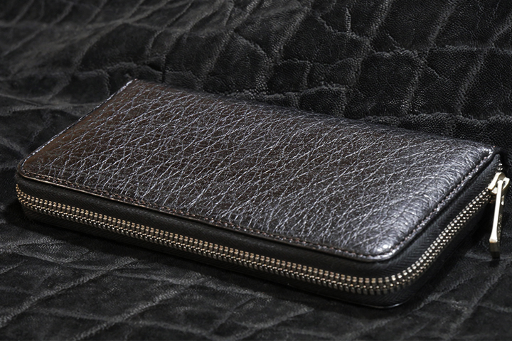 エレファントレザーはエキゾチックレザーの一種で、軽い素材でありながらも非常に高い耐久性も併せ持ちます。表面には特有のシボとシワが広がり、見た目の起毛感も相俟って独特な魅力を放っています。