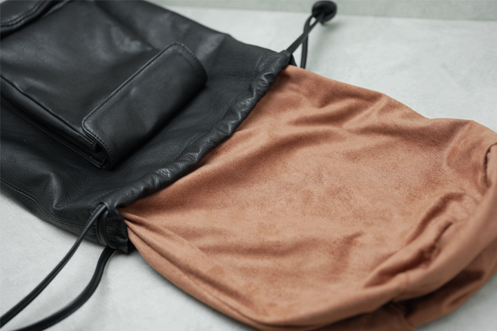 内装にはマイクロスウェードという微細な柔らかな毛足の起毛生地を合わせておりますので、収納したものを優しく包み込み、また革小物を収納すれば乾拭きの効果も期待できる仕様になっています。