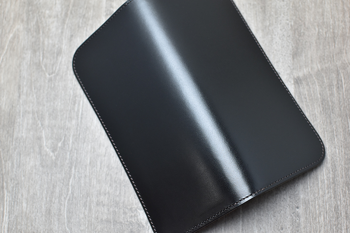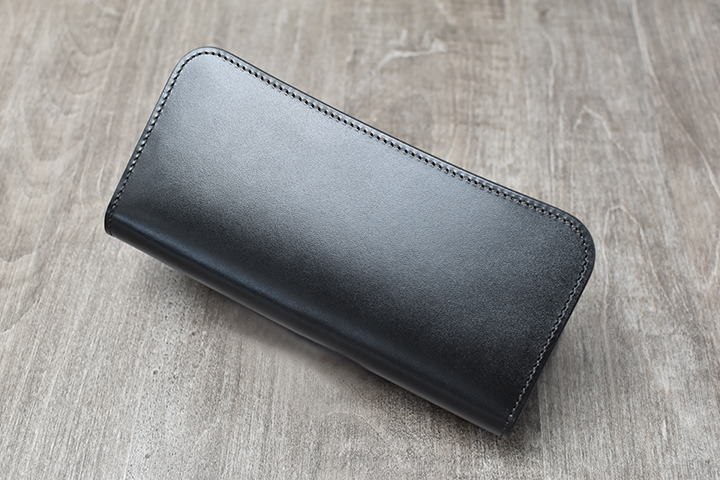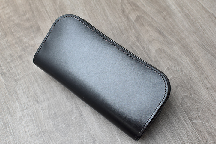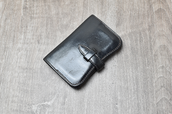 こちらは、かなり前に廃番となった名刺入れ・SADDLE PULL UP / STING(スティング)/BLACKです。全体に鋭い光沢を放っています。使用期間は10年です。光沢もさることながら、サドルプルアップの耐久性の高さを証明するサンプルになっています。