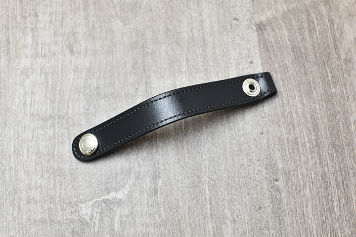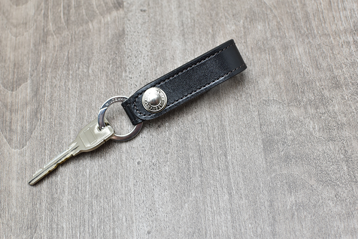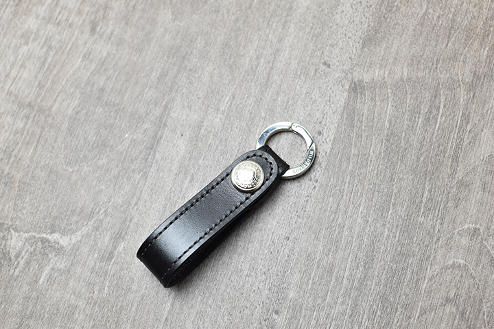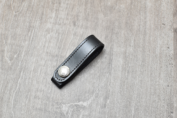 小振りなキーホルダーのLEAFです。ホックを外して帯を解くと細長い一枚革になります。