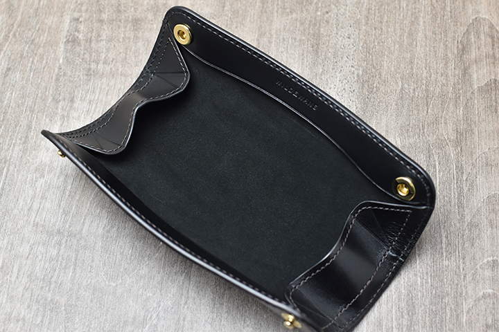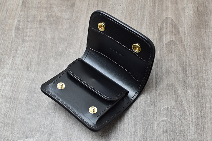 コインケースは、TONGUEと同じ位の大きさです。また、TONGUEと同様にフラップにはホックが2箇所付き、その内部には革の仕切りを設けています。このため、こちらはコイン以外にカードも収納して頂くことができます。