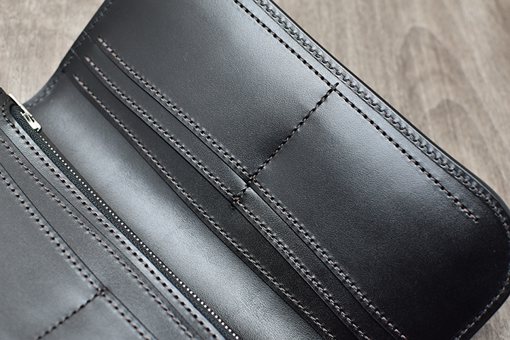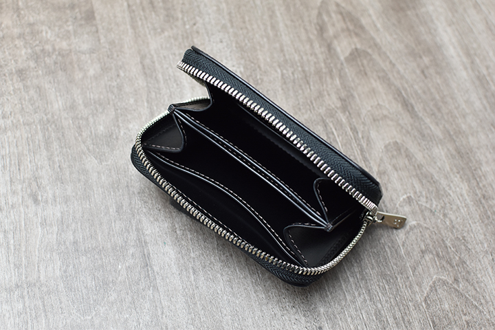 続いてコインケース側です。まずコインケースのファスナーには、SURFS1と同じエクセラファスナーを使用しています。ただし、BLISTER-Lのコインケースは舟形に開く特殊な仕様となり、マチが設けられていないにも関わらず、視認性が高く、取り出しやすい設計です。また、このコインケースの前面には2部屋のカードポケットも付属されています。