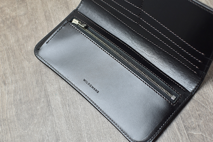 続いてコインケースです。十分な大きさなので、コインもゆとりをもって収納できます。ファスナパーツは、WILDSWANSではお馴染みのYKKエクセラファスナーを採用しています。丈夫で滑らかな引き心地を実現するクオリティの高いパーツです。