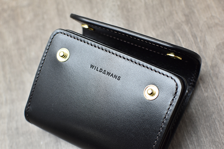 背面にはWILDSWANSのロゴが刻印されます。なお、こちらには型押しのサドルプルアップ/ブラックを組み合わせています。型押し加工を施すことで、サドルプルアップ特有のハリ感がさらに強化されます。