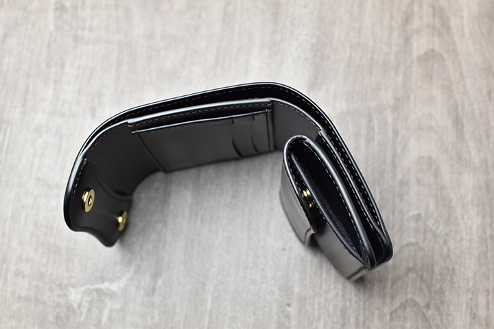 ロールされた本体を紐解いていくと内装が登場します。フラップを左に置くと、中央にカード収納部、右にコインケースの順番に配置されています。