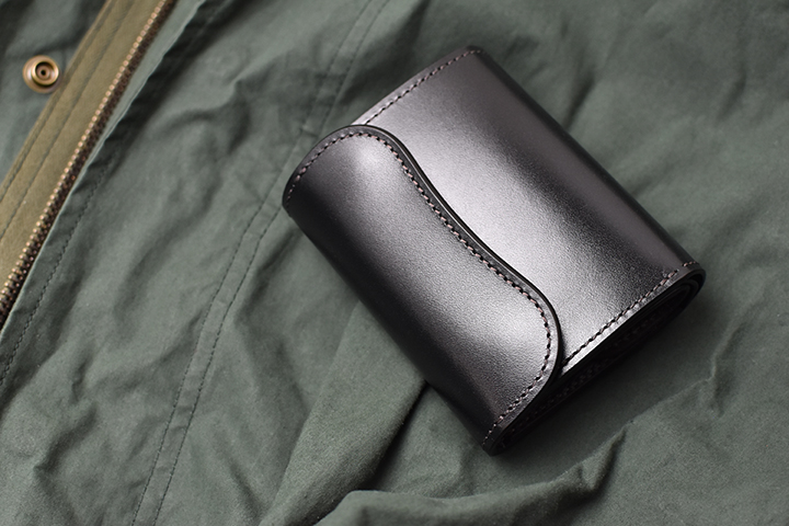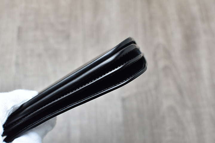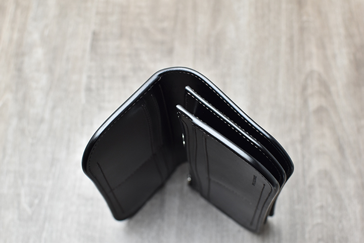 こちらも定番の三つ折り財布です。比較的小振りなボディのENOですが、側面から覗くと内部に大量の革が使用されていることが分かります。