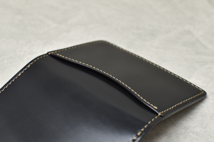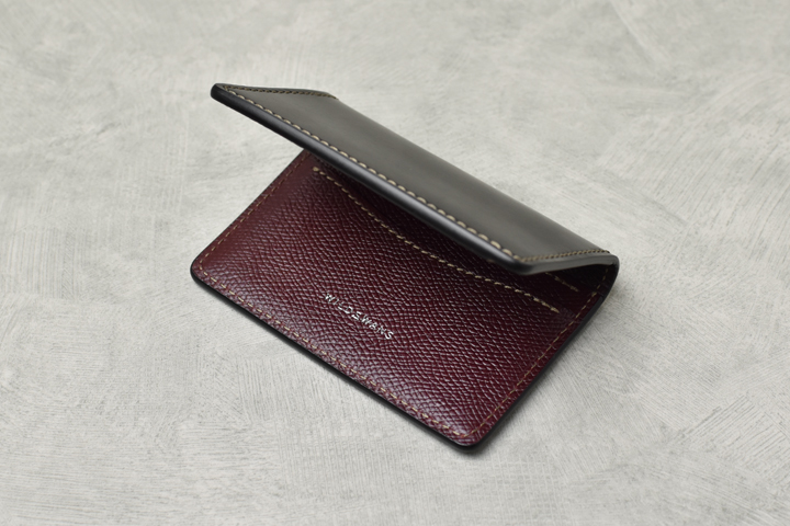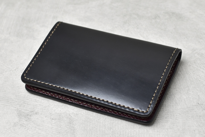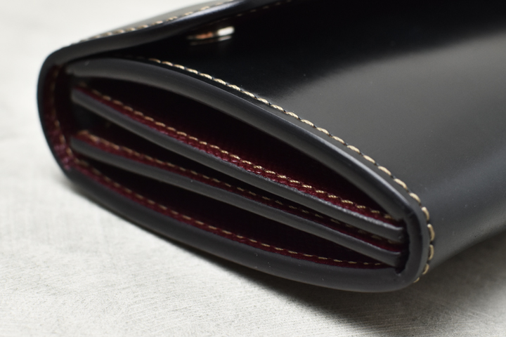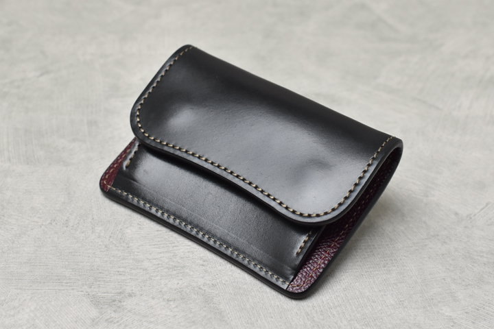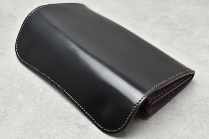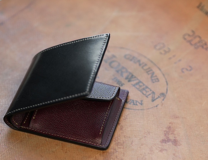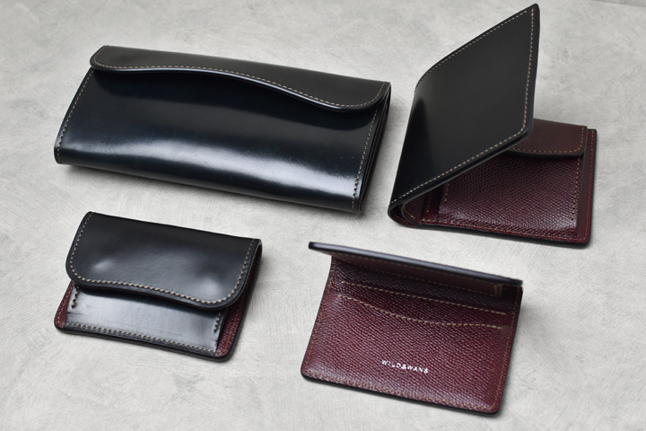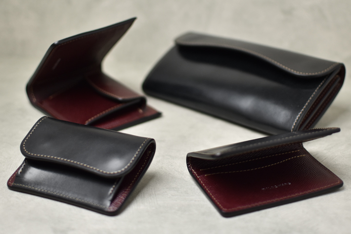 毎回ご好評を頂いているシェルコードバンシリーズ、今回は外装にシェルコードバンのブラック、内装には型押しのイングリッシュブライドルレザーのバーガンディを組み合わせた仕様にて4種のアイテムを製作致しました。
