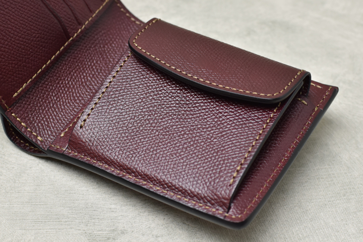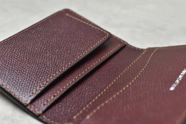 内装もすっきりとした印象のつくりです。 左側にカード段、右側にはコインポケットのオーソドックスな配置となっています。