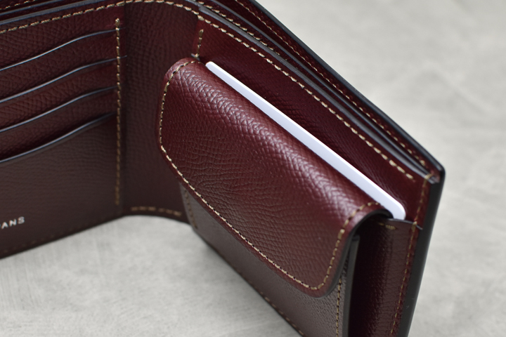 ファスナー式のコインケースが中央に位置し、その両脇にはそれぞれ6段のカード段を備えた札室として機能する大部屋が1対、更にその両サイドにはマチなしのポケットが1つずつという構成になっておりますので、持ち運ぶカードが多い方、現金派の方に特におすすめです。