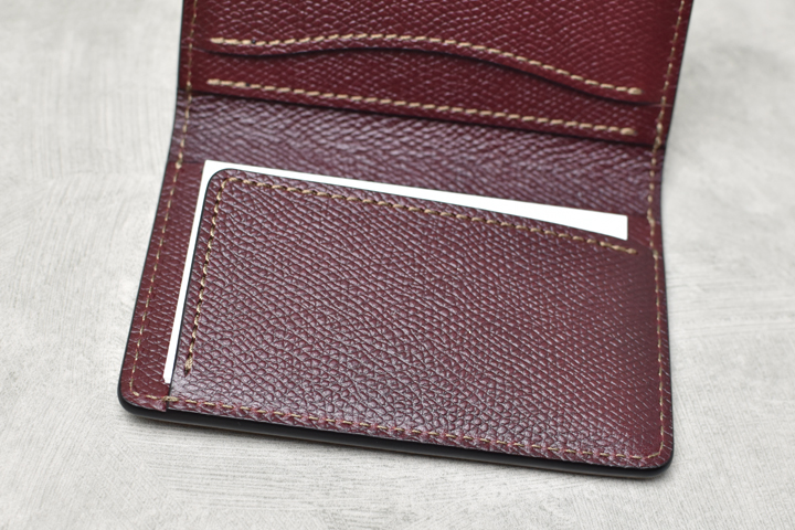 ロゴが刻印されている側にはマチなしのポケットが上下に2つ、それぞれ数枚の名刺を収納できます。