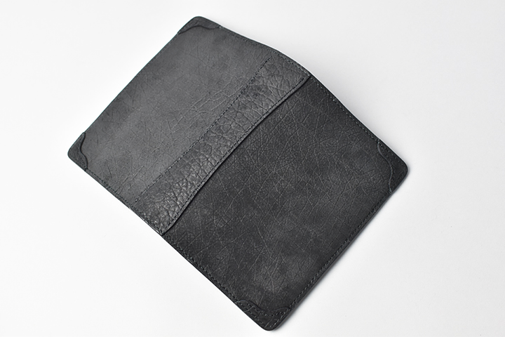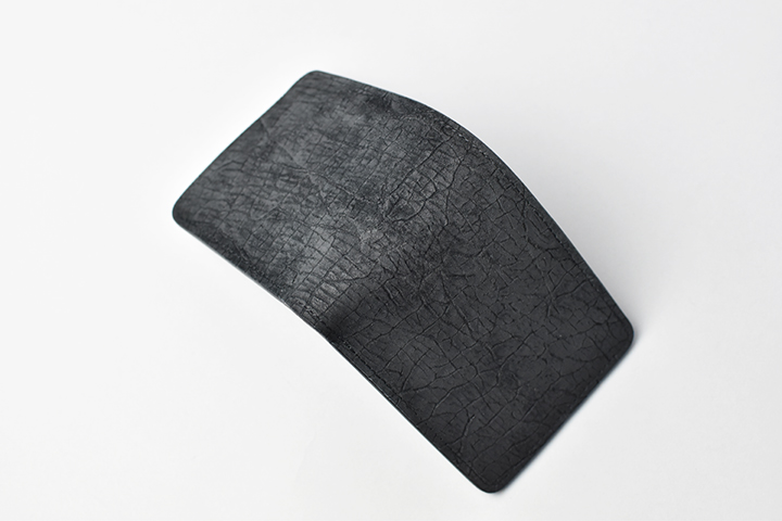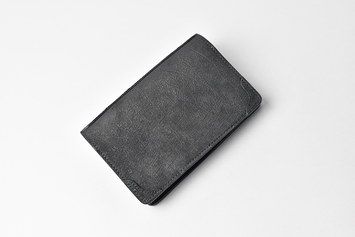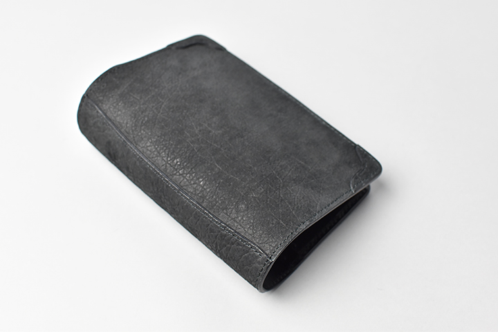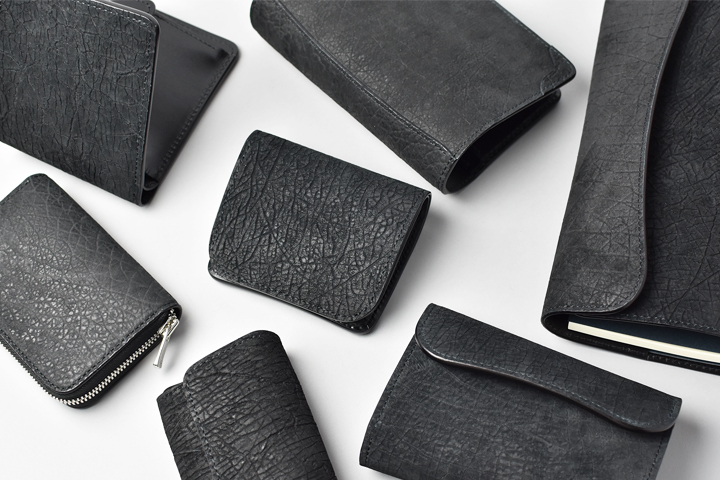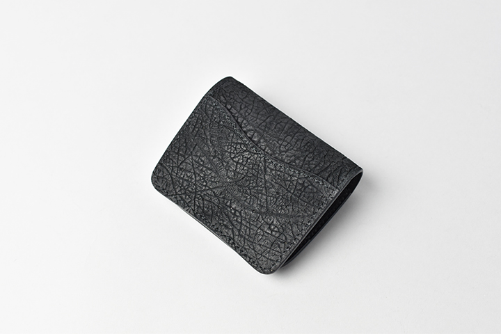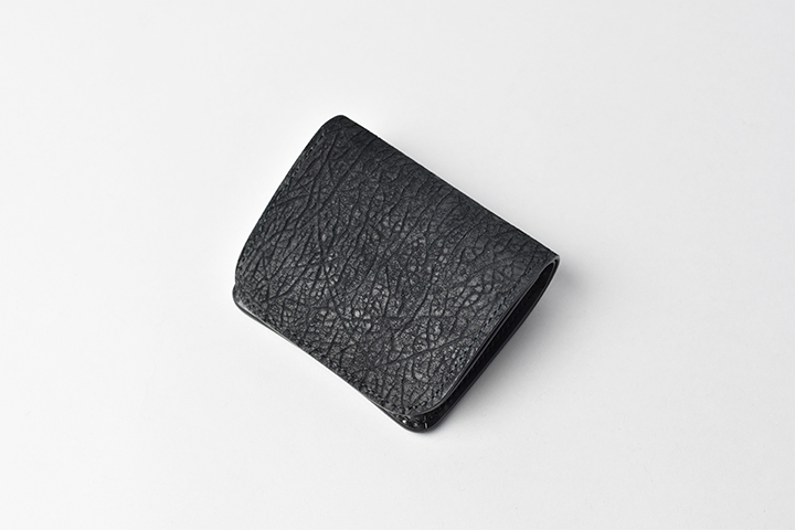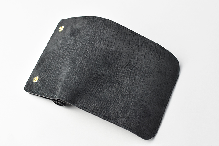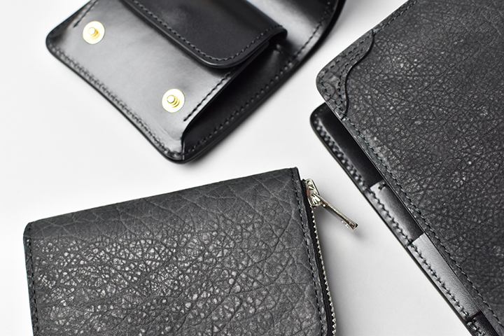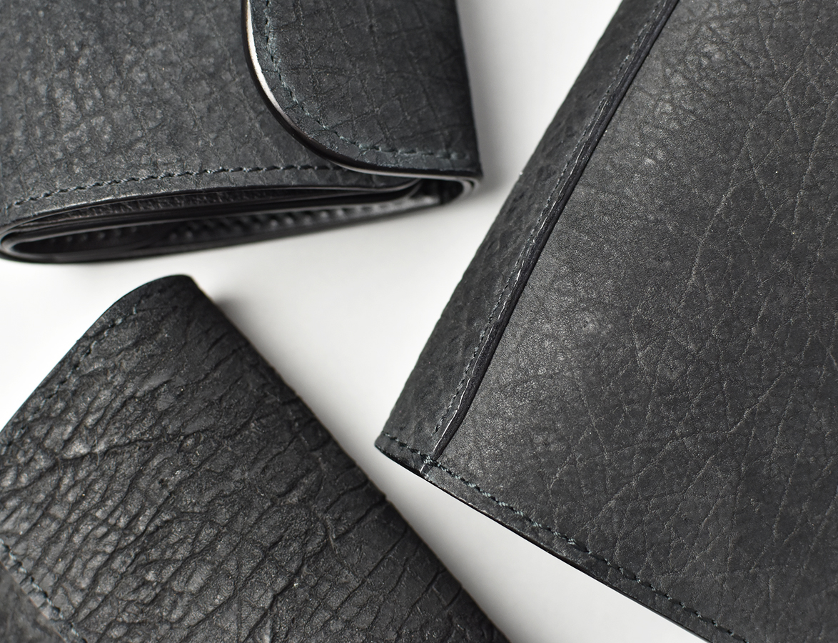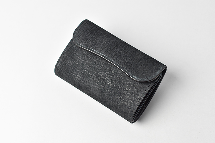 第二弾のアイテムをご紹介する前に、今回のブラックとは異なるヒポポタマスをご覧ください。こちらは藍染のヒポポタマスです。鮮やかなブルーを基調とした独特の色合いです。今回のシリーズではブラックのヒポポタマスを使用していますが、カラーによって全体の雰囲気が全く異なります。ちなみにこちらのモデルは、現在廃番となっているミニ財布のLACONIC(ラコニック)です。