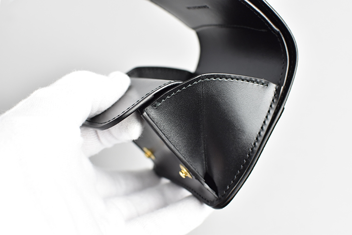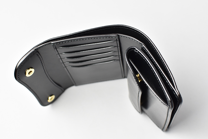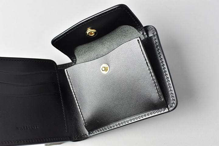 右側のコインケースはホック付きのフラップが付属します。こちらのホックはゴールドカラーとなります。内側のマチに比べて外側のマチを大きく設計することで、取り出しやすさにも配慮されています。また、コインケースの背面にはカードも収納できるポケットも用意しています。