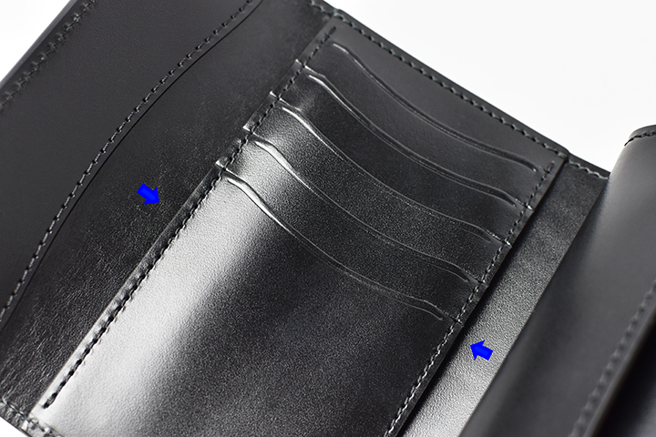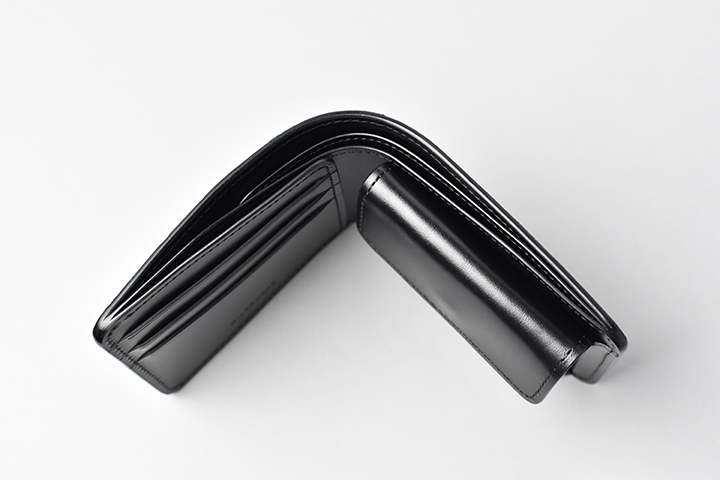 札室はカード収納部や、コインケースの奥に設けています。中には仕切りがあるので、紙幣の種類によって仕分けもできます。また、こちらの仕切りは仕切りの前後の収納量に差が出た際も、型崩れが起こらないように、仕切りの長さを全長の3/4ほどに留めています。