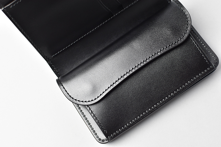 コインケースにも専用のホックが付いています。コインケースのフラップは大きなマチを前後に可動する特殊な仕様です。フラップの手前にコイン、背面にカードが基本的な収納パターンです。