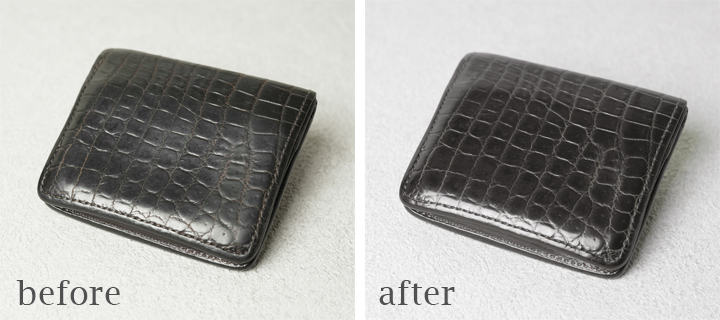 まずご紹介するのはWILDSWANSとCorbo.のチーフデザイナーである古瀬聡氏とのコラボレーション「Walkersシリーズ」から生まれたミニ財布・kf-003です。画像では表面と背面に分けてbefore&afterの様子を掲載しています。クロコに限らず、牛革でも汗や汚れ等による皮革表面の曇りは革製品のエイジングを妨げる要因の一つとなっています。こうした曇りの改善は簡単ではありませんが、木村氏は長年培った見識と技術により、見事に曇りを改善し、全体に鋭い艶を出しています。また、CHOCOLATEのカラーは、長年の使用により濃く変化しますが、曇りが取れたことによって、クロコの美しい色合いと艶がはっきりと表れています。