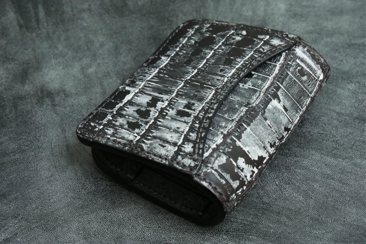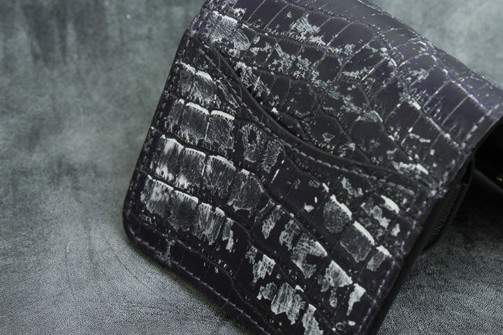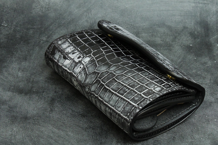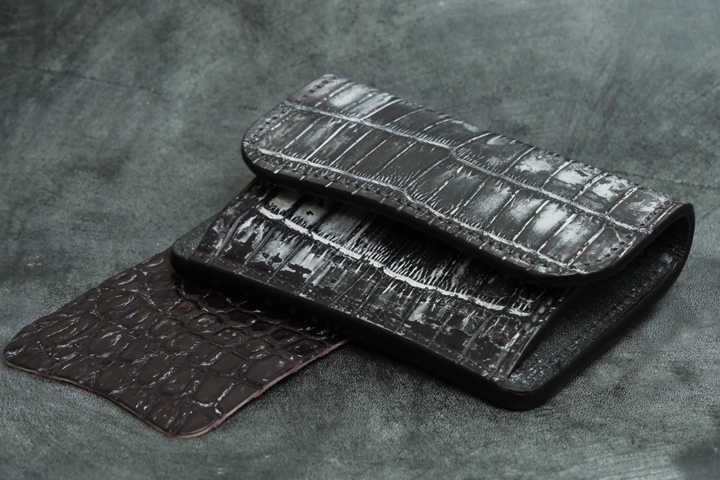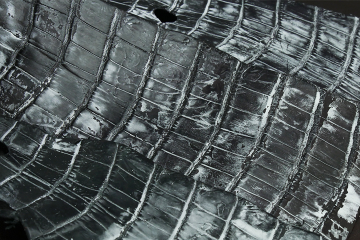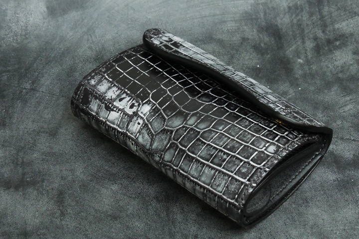 しかし、今回登場するブライドルクロコは文字通り、「クロコダイル」を用いた非常に珍しいブライドルレザーです。見た目はまさしくクロコダイルですが、牛革のブライドルレザーと同様に加脂、加蝋、染色の仕上げが施されており、革表面にはブルームと呼ばれる白い蝋分が噴き出ています。