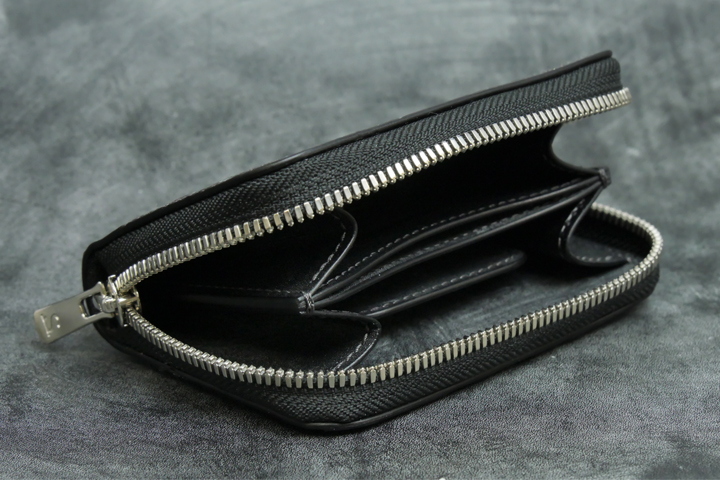 ミニ財布のご紹介が続きますが、こちらはラウンドファスナー式のLAFARO(ラファロ)です。外周のファスナーはYKK社のエクセラを使用しています。 噛み合わさる歯のような金具(務歯)1つ1つを丁寧に磨いて仕上げられるため、滑らか且つ耐久性の高いファスナーです。