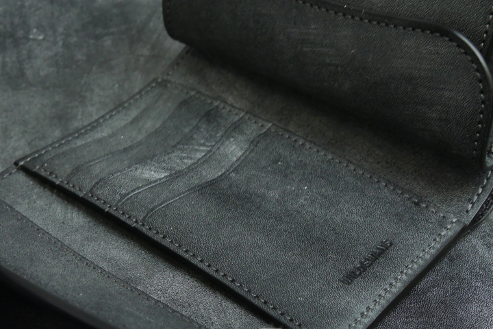 一枚革で贅沢に作られた三つ折りの構造は、手に取ると革の厚みと重厚感がずっしりと伝わってくるようです。