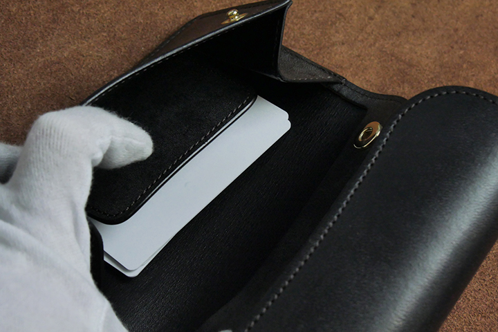 内装のカード収納部は横方向から収納する二段の収納部のほか、カード段の上部と背後の左右のスペースを合わせて5つの収納部を設けています。左右のポケットはそれぞれが独立した収納部になるため、別々にカードを収納することができます。