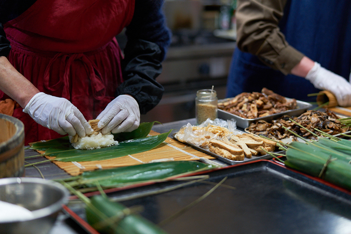 笹巻きご飯は、もち米と具材を笹の葉で包み、い草で結んだ後、蒸し上げるシンプルな料理。