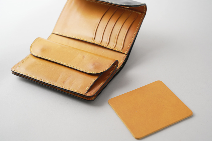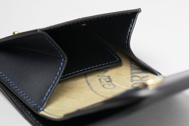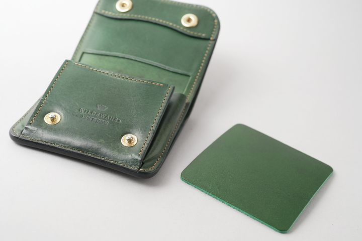 WILDSWANS製品のコインケースにはよく見られるデザインで、コインケースの中にカードを収納し、コインと分けて収納するための仕切りになります。