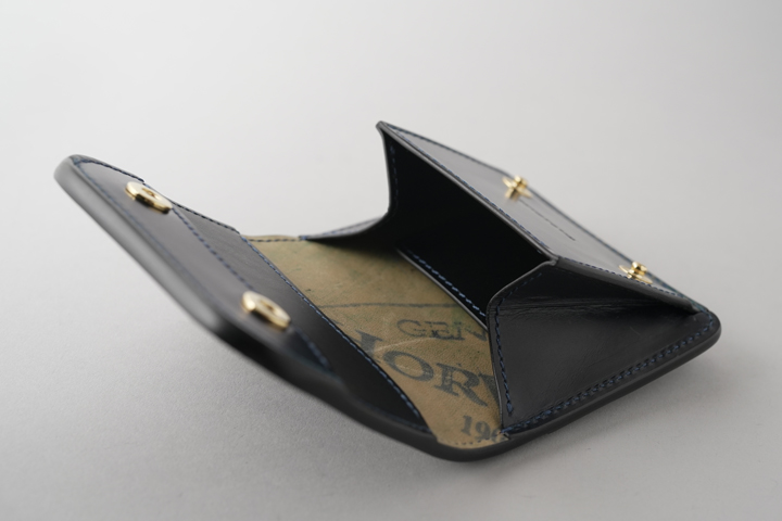 フラップは左右のホック2点によって本体に留められており、開くとコインケースの内装が現れます。
