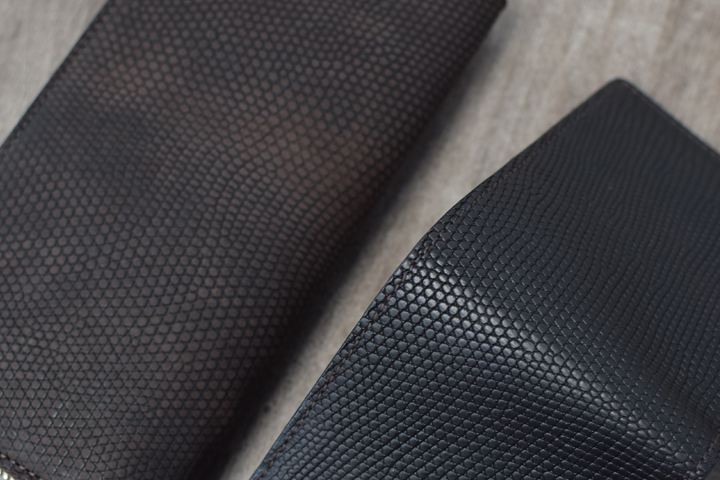 クロコダイル程ではございませんが当然ながらヌバックリザードも自然の素材を使用しているため斑の形状(大きさ)が微妙に1点1点異なります。