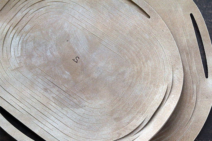 ボディは床革(革の裏面)が重なったもので、両面にレザーを貼り合わせて製作します。滑らかな質感はやすりがけによるもので、一見地味な作業ですが、一度始めるとつい没頭してしまいます。