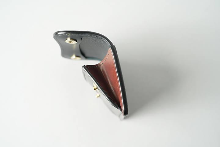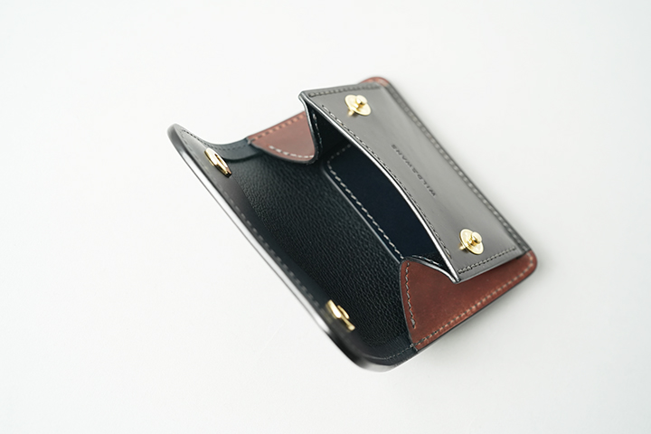 一般的な二つ折り財布よりも一回り大きなコインケースには、専用のホック(ゴールドカラー)が付きます。こちらにはコインだけではなく、カードの収納も可能です。内部は両側のマチ裏部分のみイングリッシュブライドルレザーのトコ面(=革の裏側)となっています。なお、コインケースの背面にもカードが1枚収納できるスペースをご用意しています。