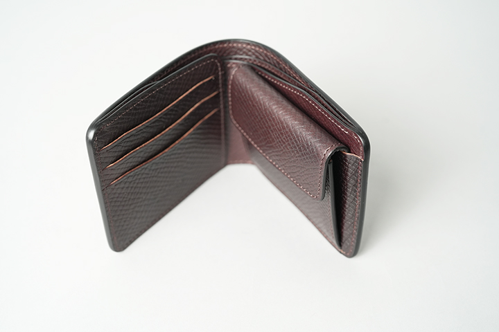 SHELLCORDOVAN / GROUNDERと同様に、内装には型押し加工を施したイングリッシュブライドルレザーを組み合わせています。ただし、ELEPHANT / GROUNDERの場合、1つの外装のカラーに対して2つの内装のパターンがあります。なお、内装の左に3段式のカード収納部、右にコインケースが配置されています。キズが目立ちにくい型押し革は、スムースレザーに比べて扱いやすく、フォーマルにも対応する素材です。