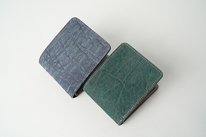 次にELEPHANT / GROUNDERです。こちらの外装にはネイビーとグリーンのエレファントレザーをそれぞれ使用しています。いずれも厳格な管理下で取引されたジンバブエ産のエレファントレザーです。全体的にツルっとしたスムースレザーのシェルコードバンに対して、ゴツゴツした岩のような質感がエレファントレザーの特徴の一つです。また、エレファントレザーには無数に走る深いシワがあり、シェルコードバンと比べて野性味を強く感じられます。
