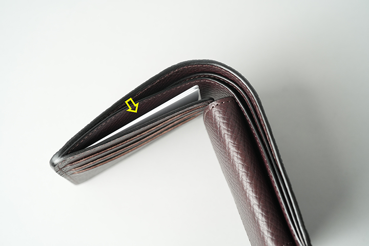 札室はカード収納部とコインケースの背後です。内部には仕切りが設けられ、紙幣の種類ごとに仕分けができます。こちらの仕切りは、札室全長の3/4の長さで設計されています。それは、仕切りの前後で紙幣の収納枚数に差が生じた際に起こる、型崩れを防止するための設計です。仮に仕切りが両サイドで留められた場合、仕切りの前後で枚数に差が生じても仕切りの可動域が限定されるため、こちらが型崩れの原因になります。