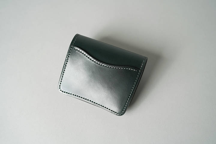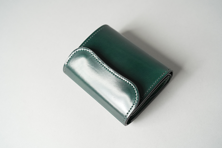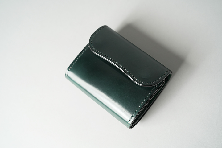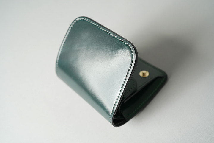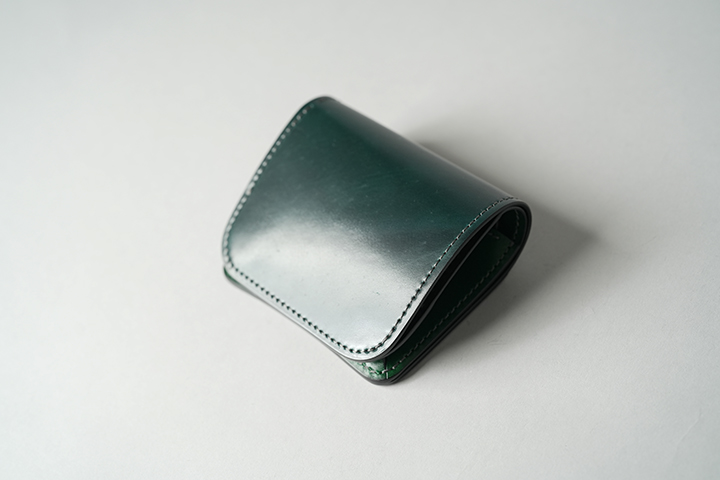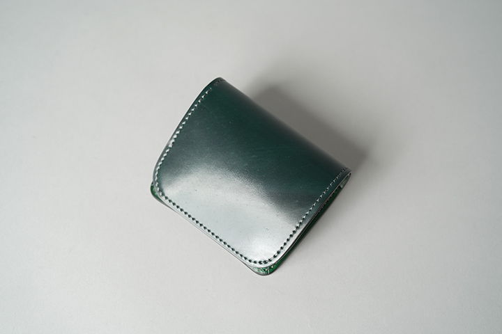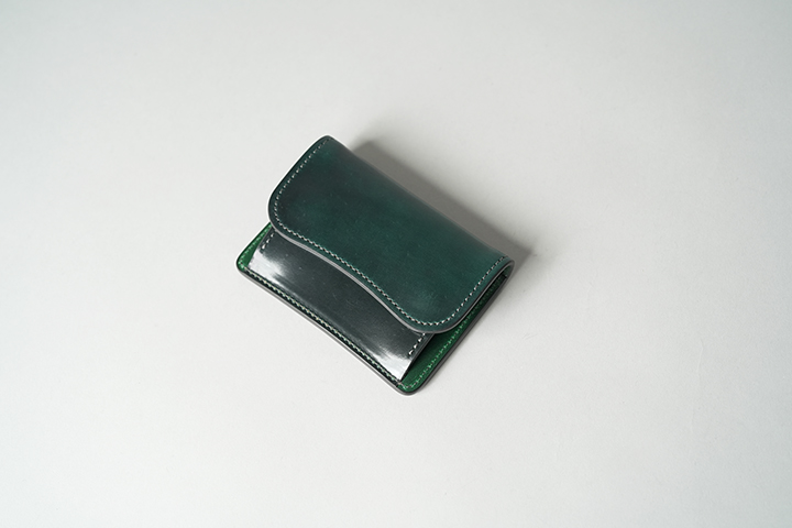 現在、残念ながらグリーンのシェルコードバンのエイジングサンプルのご用意はありません。そこでかなり色味は異なりますが、艶感の変化だけでもご確認頂くために画像上のエイジングサンプルをご用意しました。モデルは多機能コインケースのTONGUE(タング)、シェルコードバンのカラーはナチュラルです。個体差や部位にもよりますが、シェルコードバンは使用前から何処かしらに強い艶があることが多い皮革です。そして、こちらの艶は使用することで更に鋭さを増します。エイジングサンプルも使用から2年が経過して、艶に鋭さが加わりました。