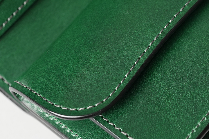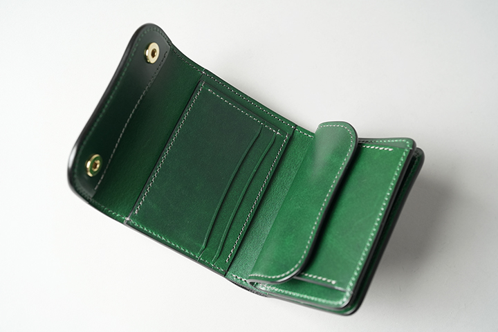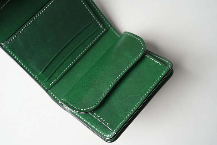 一方、内装に用いるのは、今年初めてWILDSWANSに登場したサドルプルアップのグリーンです。シェルコードバンのグリーンとは異なる、鮮やかなグリーンです。ベルギー・マシュア社のサドルプルアップは、長年にわたってWILDSWANSが製作に用いてきた皮革です。この皮革の最大の特徴であるハリ感の強さと高い耐久性は、WILDSWANSをご存知の方には周知の事実です。マシュア社もホーウィン社と同じく職人気質なタンナーであり、クローム鞣しに比べて生産期間の長いタンニン鞣しを得意としています。化学や技術の発展に伴い減少の一途をたどるタンニン鞣しですが、ホーウィン社と同様にマシュア社も自分たちの理想や製法に徹底してこだわることで、現在、多くの有名ブランドにもオリジナリティの高い皮革を供給しています。なお、上の画像でもご覧頂けますが、本シリーズのステッチカラーにはチャコールグレーを採用しています。