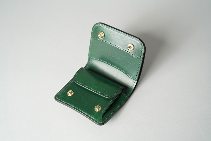 内装です。外装とはテイストが異なる鮮やかなサドルプルアップのグリーンです。下側にコインケースが配置されています。ロゴが刻印されたコインケース上のスペースは、収納スペースではないため、何も収納しないようご注意ください。