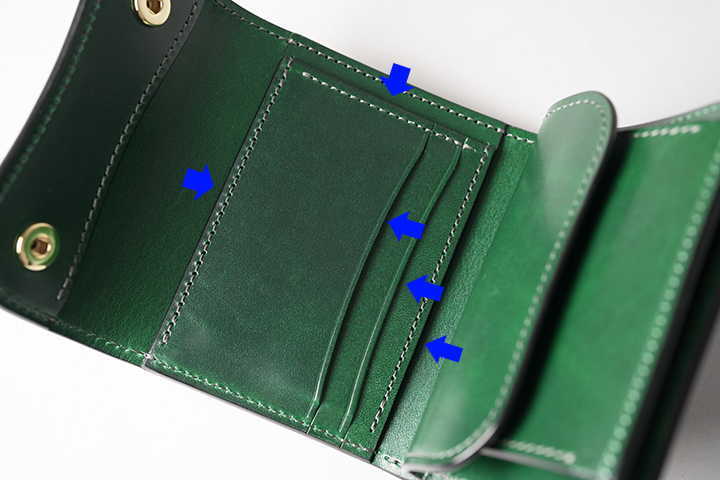 コインケースの内部には、革の仕切りを設けています。こちら仕切りを利用して前身側にコイン、背面側にカードや折りたたんだ紙幣を収納する仕組みです。