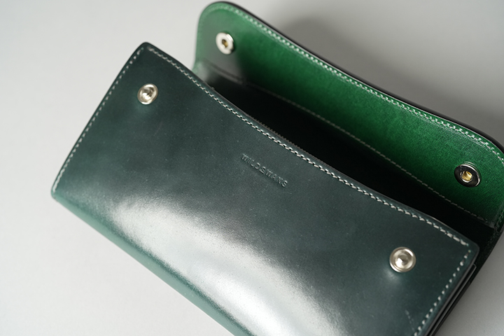 WILDSWANSのウォレットで最大級の大きさを誇るWAVE。外装のシェルコードバングリーンの迫力もこれまでのアイテムとは比較になりません。