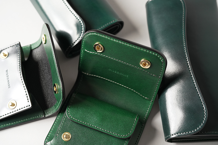 WILDSWANSでは2023年2月に続き、限定生産のシェルコードバンシリーズを展開します。今回のカラーはグリーンです。コードバンとは馬の臀部のコードバン層から採取された皮革を指します。世界には様々なコードバンが存在しますが、その中でも1905年創業のアメリカ・ホーウィン社の「シェルコードバン」は品質、実績、人気において常にトップクラスの皮革と言えるでしょう。WILDSWANSでも以前から製作に用いてきた皮革の一つですが、ホーウィン社とWILDSWANSには共通する点が多くあります。例えば、飽くなき探求心、オリジナリティへの挑戦、妥協のない品質へのこだわり、熟練職人の存在、手作業による工程の重要性などなど・・・・・。