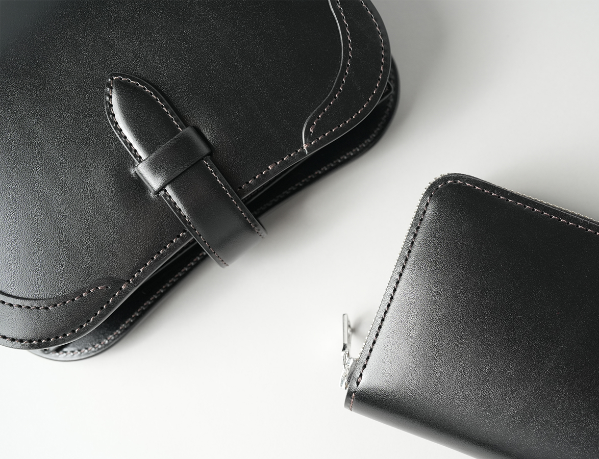 最後にサドルプルアップ/ブラックのエイジングサンプルをご覧ください。こちらはスタッフが5年程使用したサドルプルアップBYRNE/ブラックです。サドルプルアップ特有の鋭い艶感が全体を覆っています。今回ご紹介した2アイテムは、こちら以上に迫力のあるエイジングを遂げるでしょう。