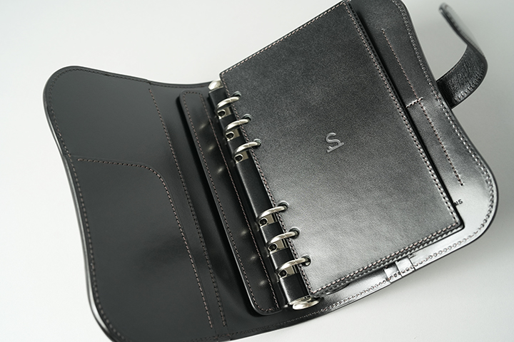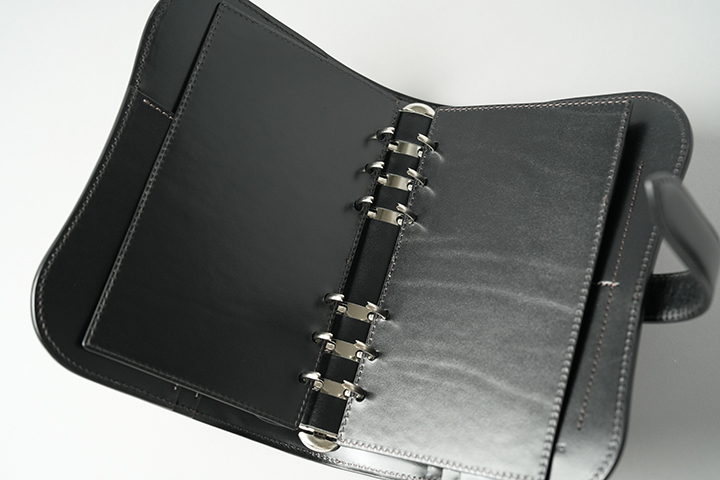 その名の通りBIBLEはBIBLEサイズのリフィルを収納するバインダー式手帳カバーです。このため、内装の中央には6穴式のバインダー金具を配置しています。