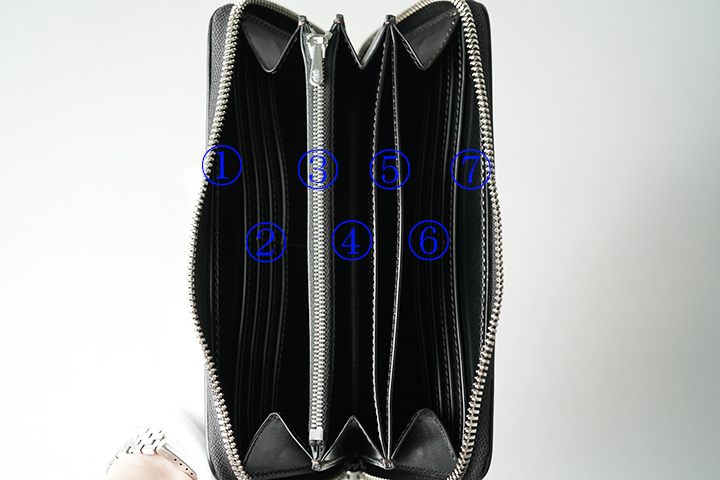 ② 、⑥・・・・それぞれに6枚のカードが入るポケットを備えた、両マチ式のスペースです。こちらにはカード以外に、紙幣がたっぷり収納できます。