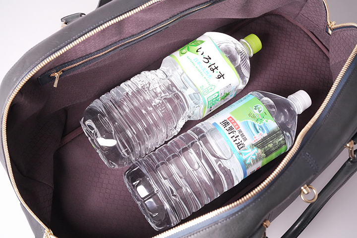 間口が大きいバッグにはダブルファスナーが欠かせません。ミネルバボックスによく映えるゴールドカラーのパーツです。こちらを開くと大きな内装が口を開けます。中にはWILDSWANSのオリジナルコットンを採用することで、内装にも耐久性も意識しています。メイン収納部はかなりの収納力です。サイドにポケットを設置していますが、メイン収納部には仕切りなども設けていない分、ユーザーが思いのまま収納することができます。1週間位の出張や旅行でも十分に対応してくれる容量です。