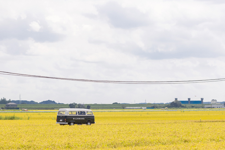 WILDSWANSの生誕地・河内町は稲作が盛んな地域で、秋には広大な大地が黄金色に色づきます。お客様を乗せ、地元の輝く田園風景を走るワーゲンバスをイメージして、アトリエの傍に稲穂を描きました。