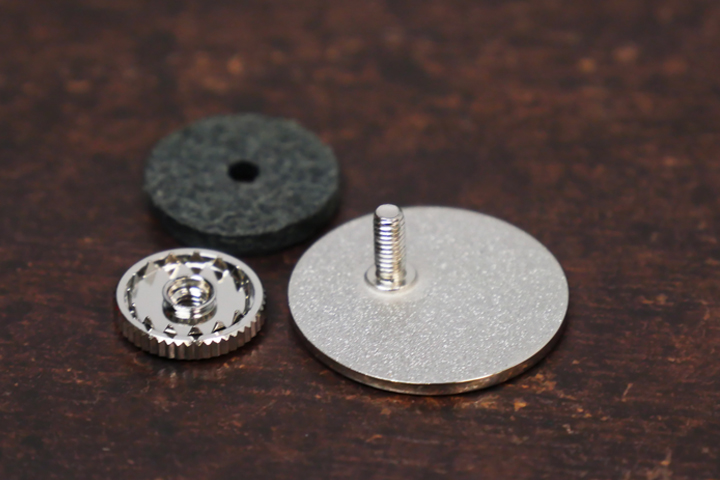 ピンズには革製のスペーサー(直径約15mm、厚さ約2mm)が1枚付属します。ピンズと留め具の間に差し込むことで、ピンズを装着した際に針先の飛び出しを軽減します。留め具の凹凸にしっかりと噛ませるため、革の床面(裏面)が上向きになるように挟み込んでお使いください。