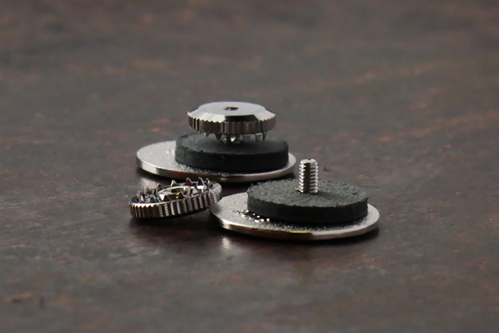 オリジナルピンズはジャケットのラペル(下襟)にあいたフラワーホールやキャップのアイレット(穴)につけることを想定し、スクリューナットと呼ばれるネジ式の留め具がついています。本体・留め具共に真鍮製のニッケルめっき仕上げです。