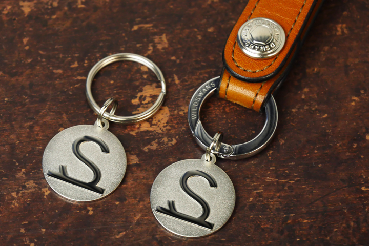 ピンズタイプの他に、キーリングタイプもご用意しました。本体は真鍮製、金具は鉄製のニッケルめっき仕上げです。付属の二重リングはカラビナキーリング(M)に付け替えて使用することもできますし、お手持ちの金具との併用も可能です。小物や鞄に取り付ける等、より装着の幅が広がります。