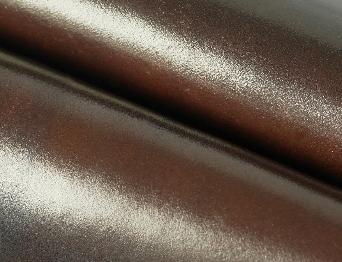 2023年4回目のご紹介となる限定シェルコードバンシリーズ。今回のカラーはダークコニャックです。カラー名のコニャックは、ブランデーの一種でフランスにある同名の街が由来になっているそうです。見た目には茶褐色のお酒ですが、こちらにダークを付けることで何となくイメージ通りの色合いになっています。見る角度や光の具合により、カーキ、ブロンズ、ダークブラウンなど様々な色合いにも見える、とても不思議なカラーです。WILDSWANSではかなり前から製作に用いているカラーですが、その登場回数は極めて少なく、現在パターンオーダーでもご使用頂けないカラーであることを考えると、前回ご紹介した#4と同様に、レアカラーと呼んでもいいかもしれません。